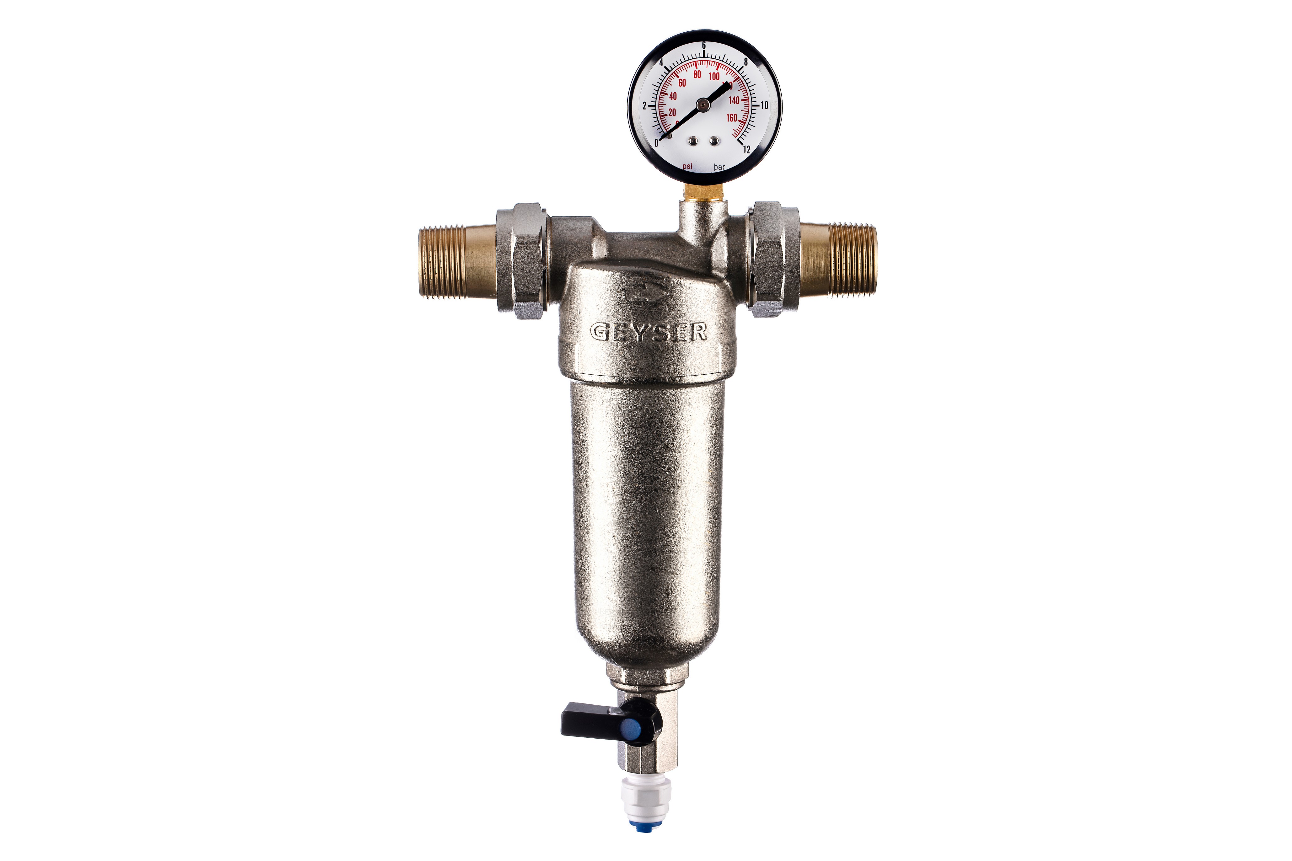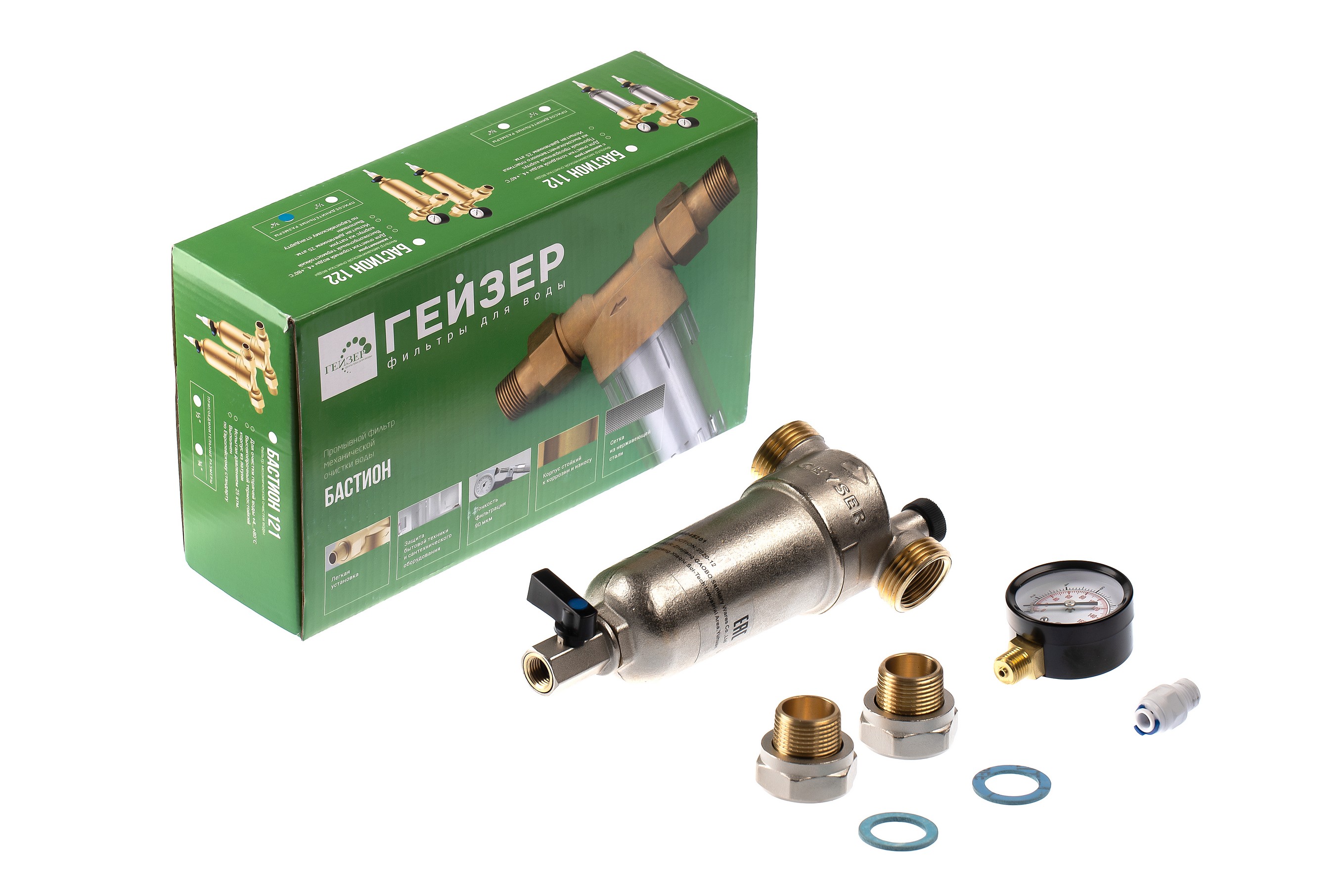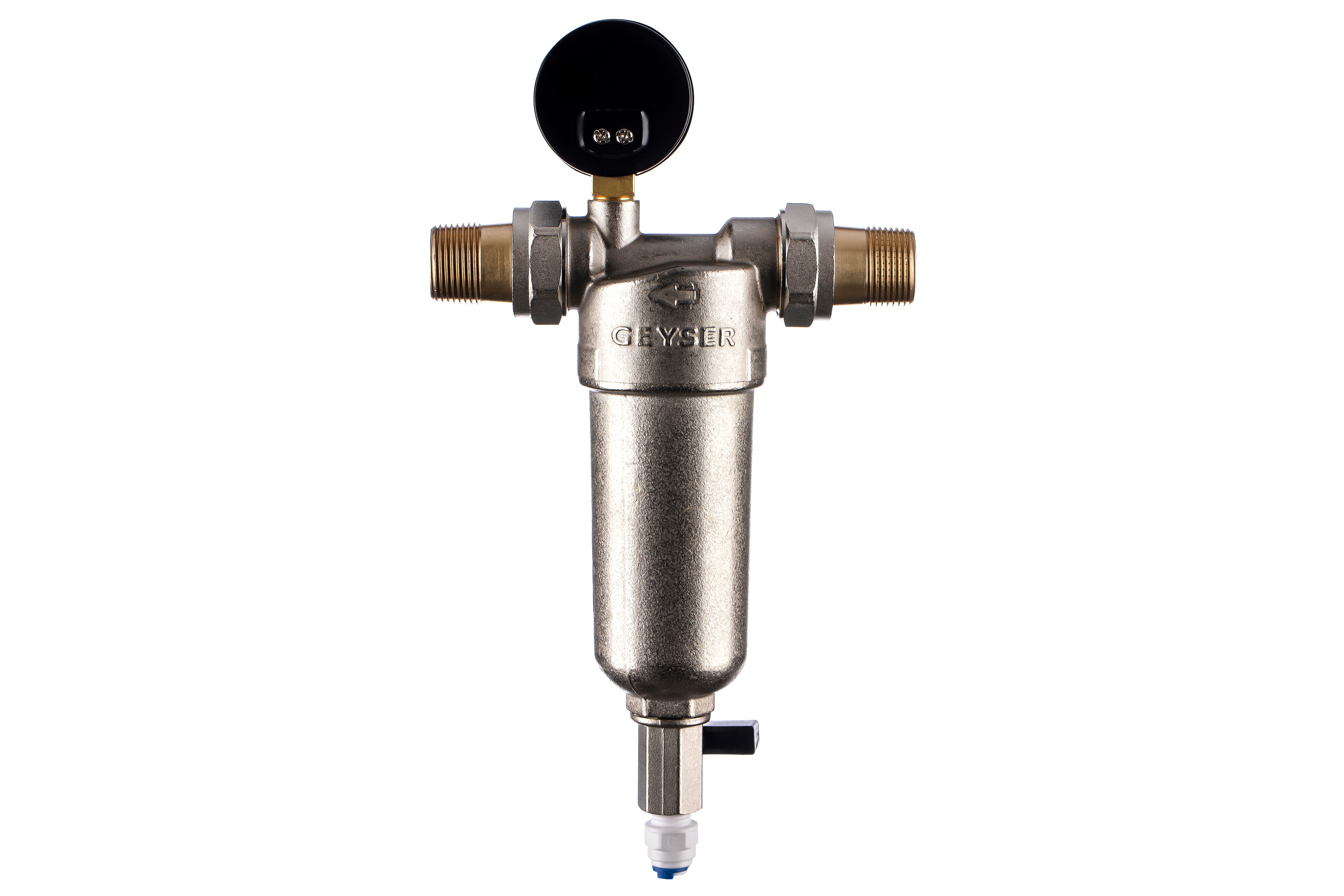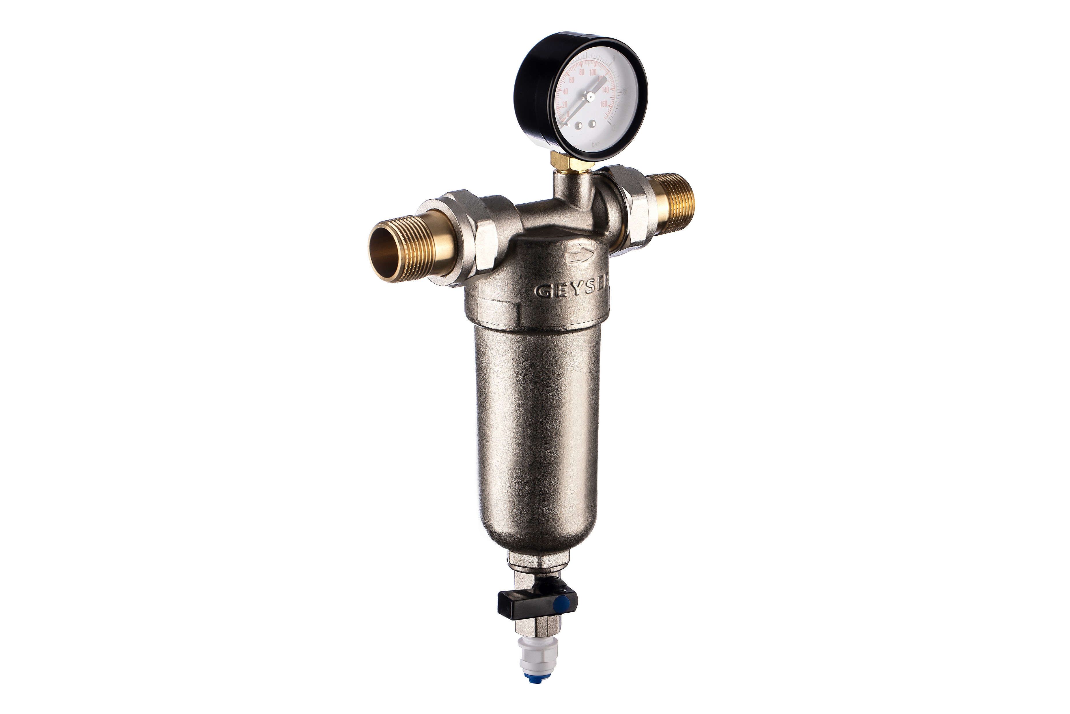 Фильтр промывной с манометром ГЕЙЗЕР БАСТИОН 122 Ø60 никель 3/4" АМ-АМ, 90 мкм, латунная колба