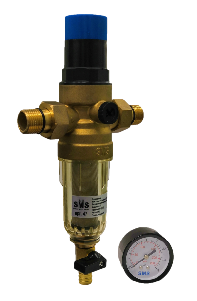 Фильтр промывной с редуктором SMS 47-G1/2 без покрытия 1/2" АМ-АМ, 100 мкм, пластик колба