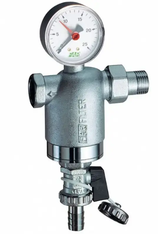 Фильтр промывной с манометром FAR никель 3/4" АМ-ВР 100 мкм, (Max: 95°C, 25 бар)